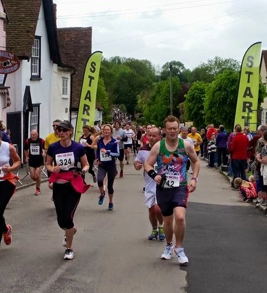 Emily & Paul had spotted me & we wandered around the village to acquaint ourselves with the new start / finish locations before heading onto the village green. Suddenly I noticed the difference between this & previous years. I now recognised far more people from the parkrun & made an effort to say hello & wish folks well in the upcoming race. We visited the t-shirt table to ask for a sneak peak of the this years colour, a slightly blue grey, very similar to my Stockholm Half shirt from 2012. The quality of the print appeared to have been improved & the event emblem was now the sole feature of the front, with sponsors on the back. We enquired about the medals & were told that they were just for the kids race, this was confusing as we were sure they'd been some special 30th anniversary bling advertised. After a brief joke about leaving it was time to focus on getting race ready. Toilet, car to drop stuff, warm up, toilet, line up for the start. The provision and / or positioning of the toilets could do with a a bit more thought. I think the number of portaloos was similar to previous years, but they were previously supplemented by the village hall. There were queues, but then that is also a good way to kill 10 minutes before the race begins.