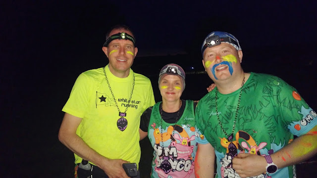 We picked up our luminous race t-shirt & glow in the dark medal & made our way back to the car. It was time to clean up a bit before the three hour journey back home. We'd stop for food somewhere en route & in order to appear slightly normal I suspected the bright blue moustache might have to go. Of course if I had planned ahead I might have a towel available to me. Instead I had to innovate & for once I was happy for sweating profusely during the run & christened my new Um Bongo t-shirt by wiping the face paint from my face!
